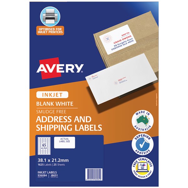 AVERY 936084 J8651 QUICK PEEL ADDRESS LABEL SURE FEED INKJET 65UP WHITE PACK 25