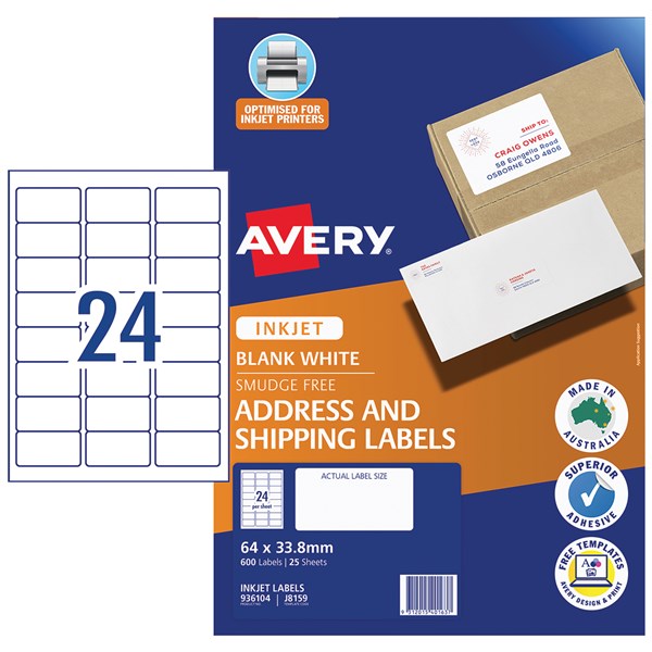 AVERY 936074 J8165 SHIPPING LABEL INKJET 8UP WHITE PACK 25 SHEETS