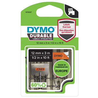 DYMO 1978367 D1 DURABLE LABEL CASSETTE TAPE 12MM X 3M BLACK ON ORANGE