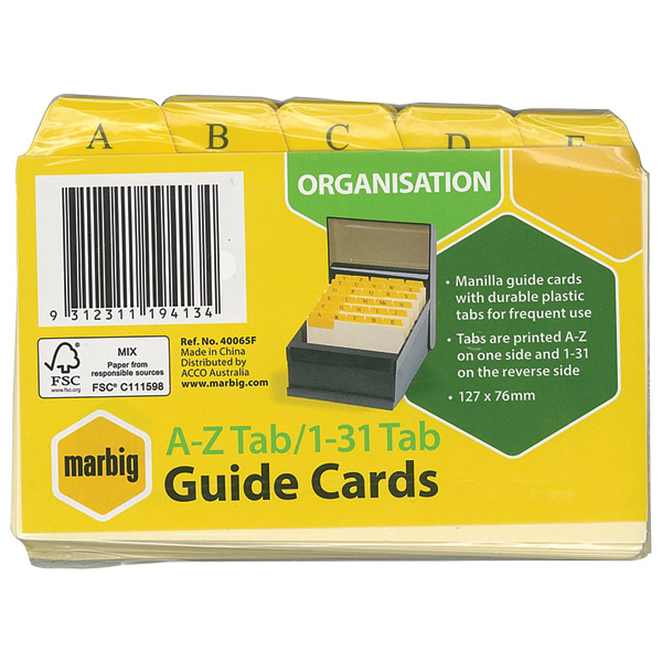 MARBIG GUIDE CARDS A-Z/ 1-31 TAB 203 X 127MM BUFF MANILLA PACK 30