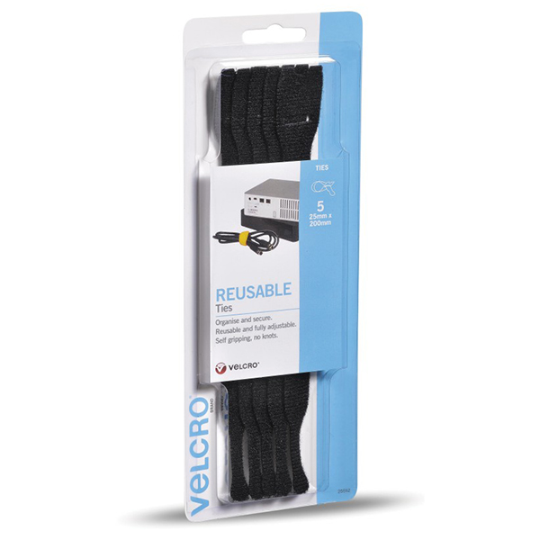 VELCRO ONE WRAP REUSABLE TIES 25 X 200MM BLACK PACK 5