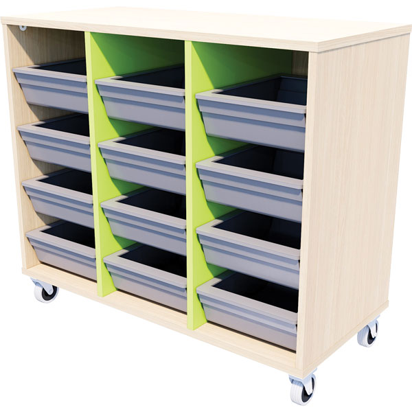ZEALAND TOTE TRAY STORAGE UNIT MOBILE W892 X D425 X H900MM AGED ASH FRAME JUICY DIVIDERS